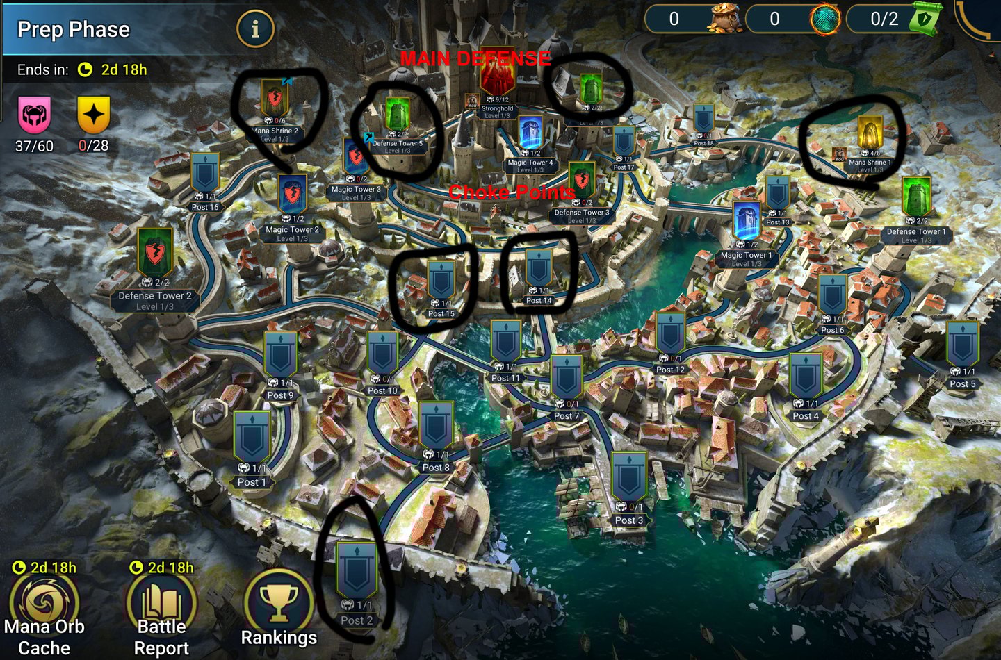 For Defense, we want our high teams in Defense Tower 5/4 1 in stronghold, 1 in Mana Shrine 1/2